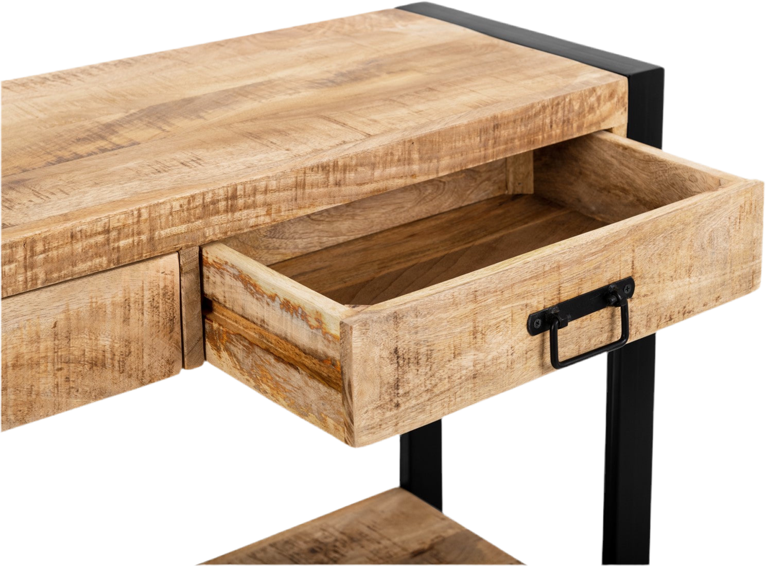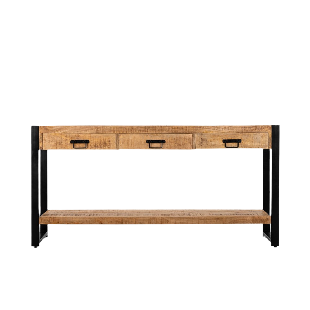 De sidetable heeft een minimalistisch ontwerp met slechts een beperkt materiaalgebruik. Het heeft maarliefst drie laden voor opbergruimte, omlijst door een frame van staal dat het mangohout elegant accentueert. Een extra plank of schap biedt de mogelijkheid om decoratieve items, zoals een pot, tentoon te stellen. Dankzij de hoge poten staat de sidetable hoog en luchtig, waardoor het een ruimtelijk gevoel geeft aan de omgeving. Dit ontwerp met minimale materialen zorgt voor een strakke en eigentijdse industriële uitstraling, perfect geschikt voor moderne interieurs die streven naar eenvoud en functionaliteit. De sidetable is een veelzijdige en stijlvolle toevoeging aan elke ruimte.