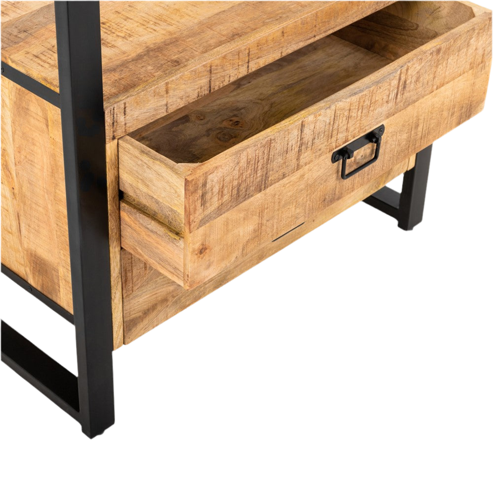 Het lage kastje met hoge pootjes heeft een volledig zwart stalen frame dat het mangohout omlijst voor een strakke en moderne uitstraling. Het kastje staat op hoge pootjes, wat een luchtige en eigentijdse look creëert. Het heeft een open vak en twee laden, waardoor er voldoende opbergruimte is voor spullen, terwijl het zwart-witte kleurenschema een minimalistische en stijlvolle esthetiek biedt. Het poedercoat zwarte staal en het zwart afgewerkte mangohout zorgen voor een harmonieuze en eigentijdse uitstraling.